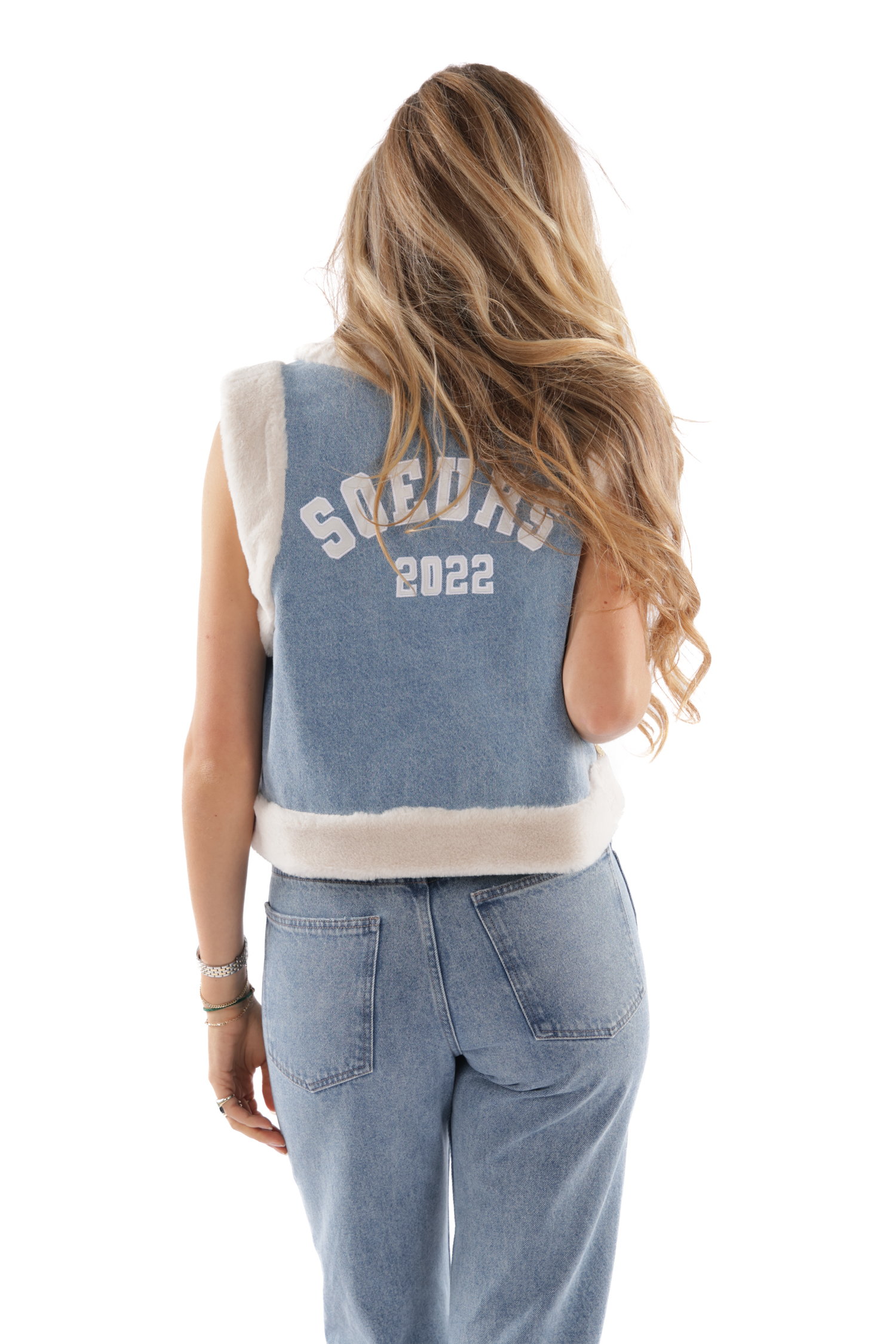 Fantine is een gilet dat je op twee manieren kunt dragen: de ene kant is uitgevoerd in zachte creamkleurige faux fur, de andere kant in lichtblauw denim met op de rug “SOEURS 2022” in sportieve varsity-stijl. Welke kant je ook kiest — hij geeft instant attitude en zachtheid tegelijk.