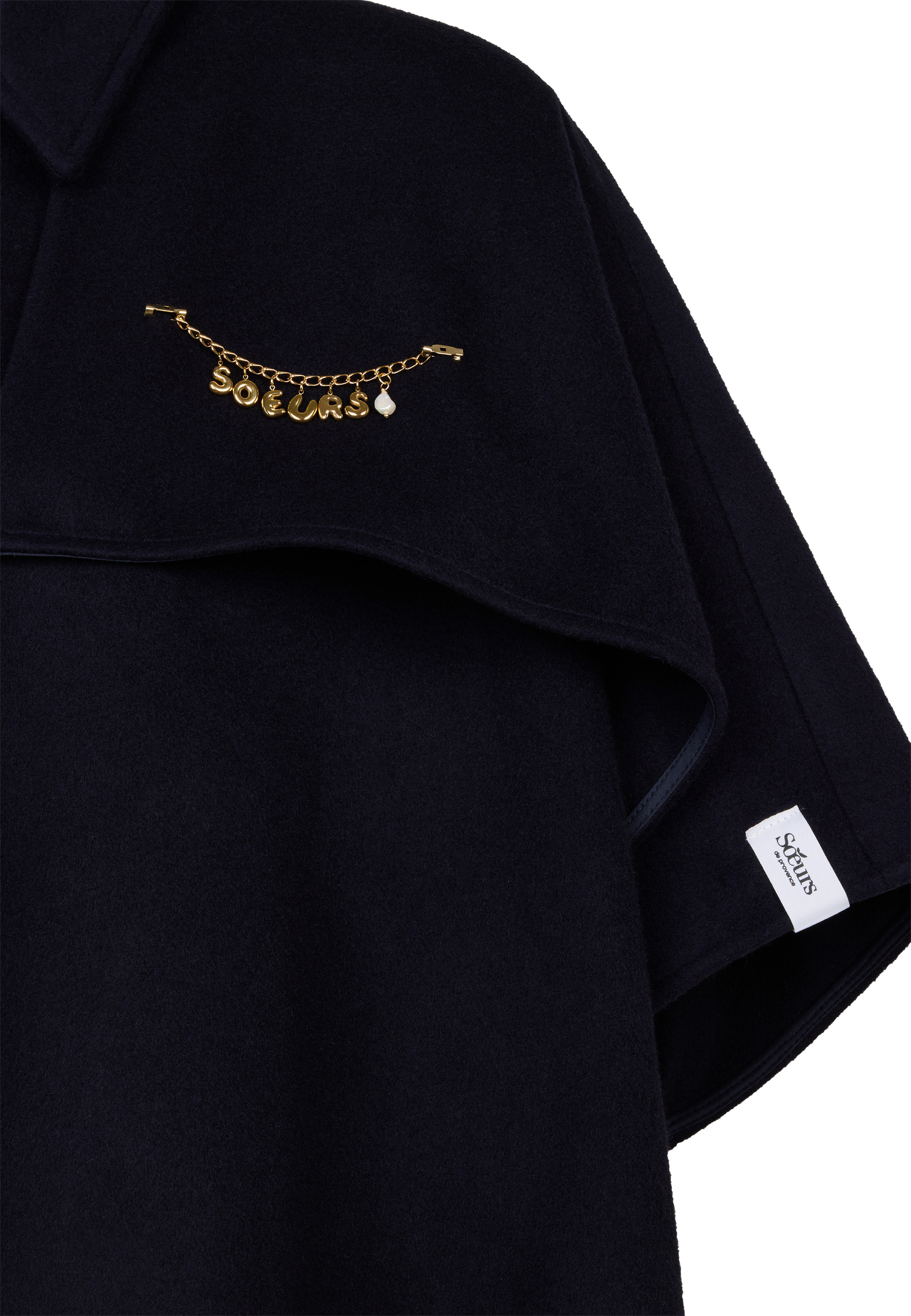 Deze blauwe cape van Soeurs de Provence heeft een klassieke kraag en een zichtbare knoopsluiting aan de voorzijde. De korte wijde mouwen en de extra laag stof over de schouders geven het item een kenmerkend silhouet. Op de borst bevindt zich een goudkleurige speld met de letters van de merknaam en een witte kraal. De Fenna Cape Navy is afgewerkt met een wit merklabel op de mouw.